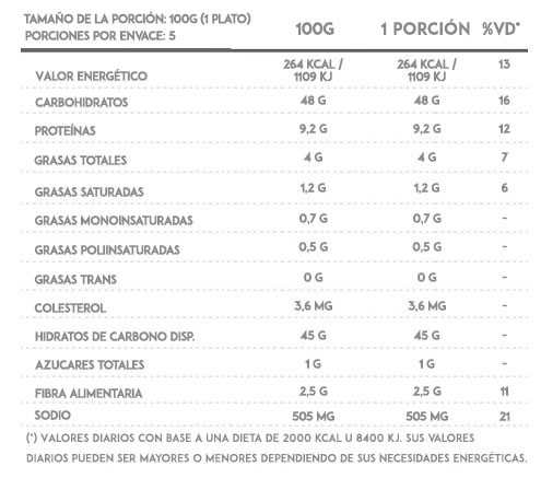 MASA: semolin, agua, huevo en polvo, emulsionante: lecitina de soja, conservantes: propionato de calcio y sorbato de potasio, acidulante: ácido cítrico. RELLENO: ricota (21%), rebozador (harina de trigo y agua), agua, aceite vegetal interesterificado de soja y algodón, queso muzzarella (3%), sal, queso reggianito (1%), queso danbo (1%), nuez moscada, pimienta blanca y aromatizante idéntico al natural. CONTIENE: GLUTEN, HUEVO, SOJA Y PRODUCTOS LACTEOS.